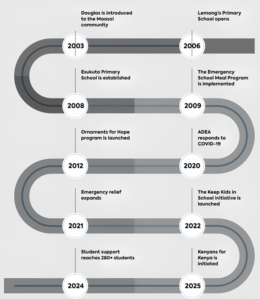 ADEA Foundation began in 2003 when Douglas McFalls visited Rombo, Kenya, recognizing both profound challenges and powerful potential within the Maasai community. Initially focused on establishing primary schools, ADEA soon expanded to individual student support, food security, home-garden agricultural and foundational adult literacy, vocational training, and women’s economic empowerment. Our approach remains deeply relational, driven by local leadership, cultural respect, and practical solutions. Nearly two decades later, we continue partnering closely with Maasai communities, turning hardships into opportunities, dreams into realities, and empowering youth and families to confidently shape their own futures.